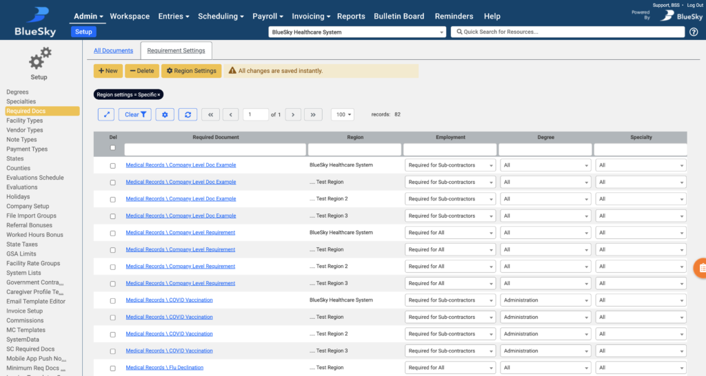 BlueSky now supports defining Required Documents at the Region level, allowing credentialing rules to be inherited from the company or explicitly overridden for specific regions. Requirements can be configured by employment type, degree, and specialty, giving organizations more flexible and scalable control over regional compliance needs.