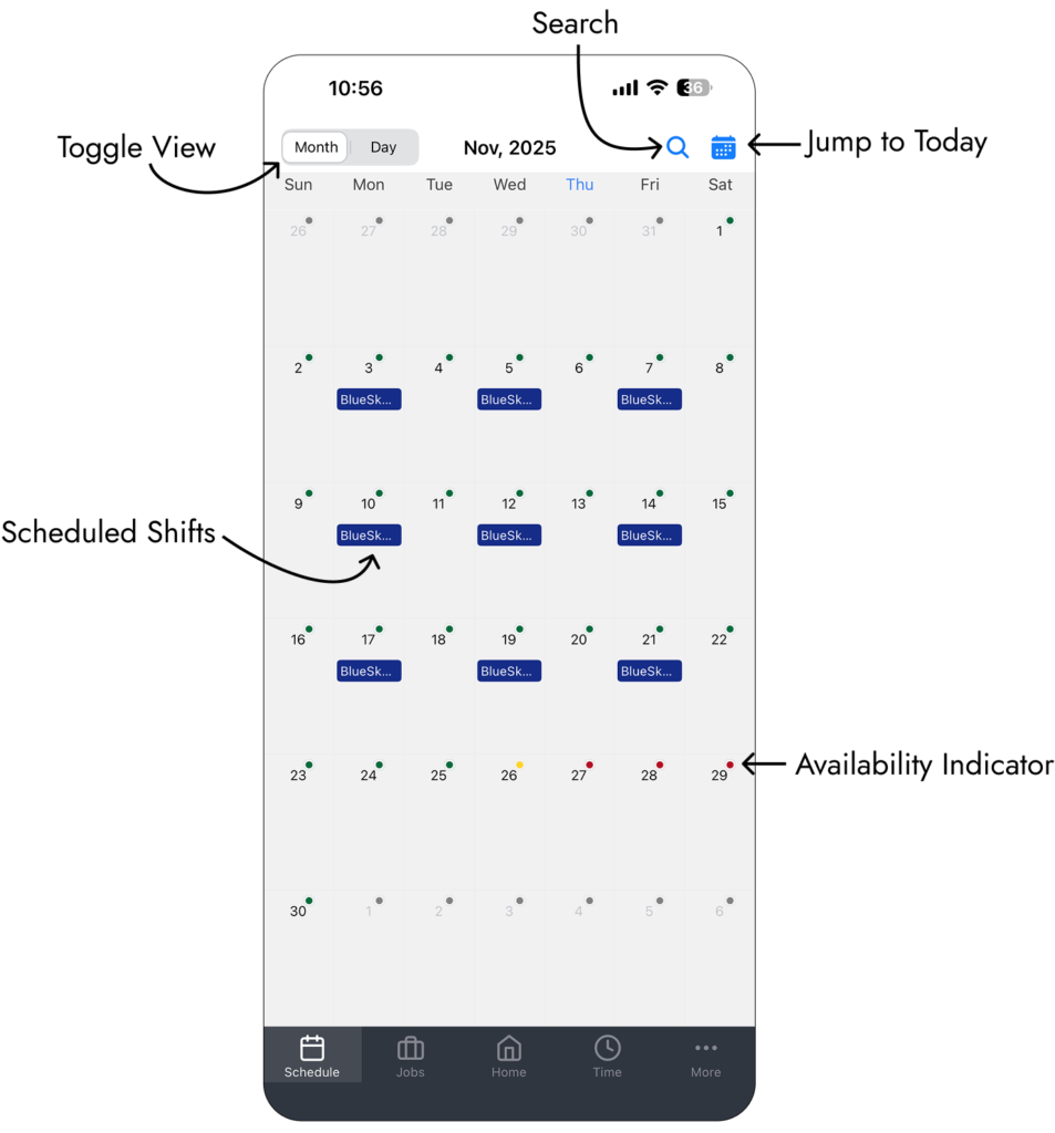 The BlueSky caregiver mobile app received a refreshed Schedule view with a full calendar layout. Caregivers can now enter daily availability and preferred shifts directly in the app, making it easier to communicate scheduling preferences. Availability updates sync instantly to the web portal, giving recruiters and schedulers real-time visibility without manual follow-up.