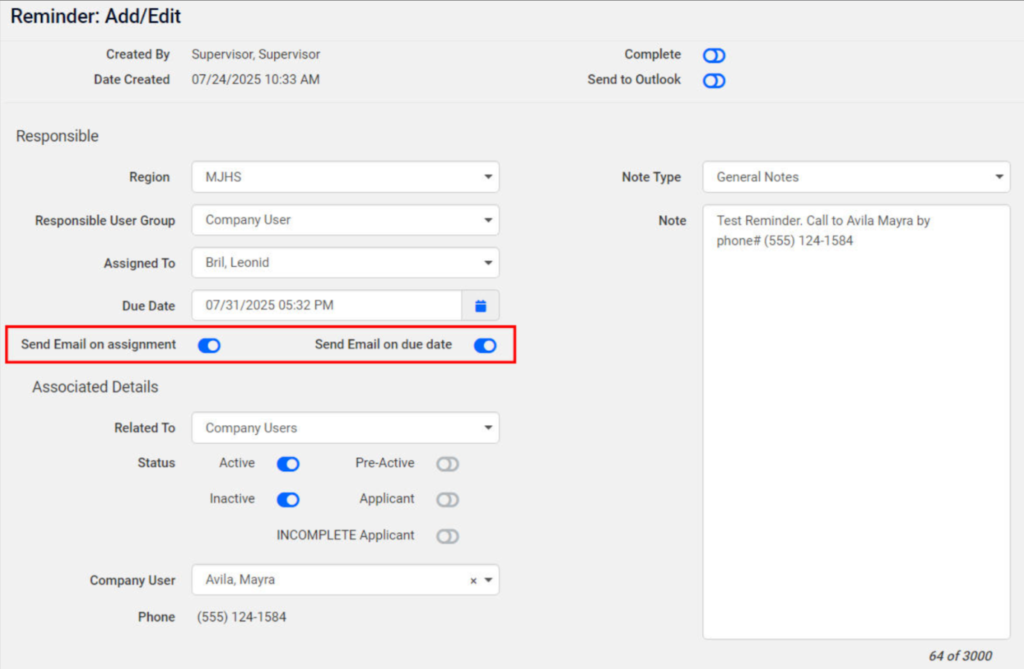 Reminders can now trigger automated email notifications when assigned to a user and, optionally, on the due date. These emails include full reminder details and a one-click option to mark the reminder complete, with new templates available in the Email Template Editor for customization.