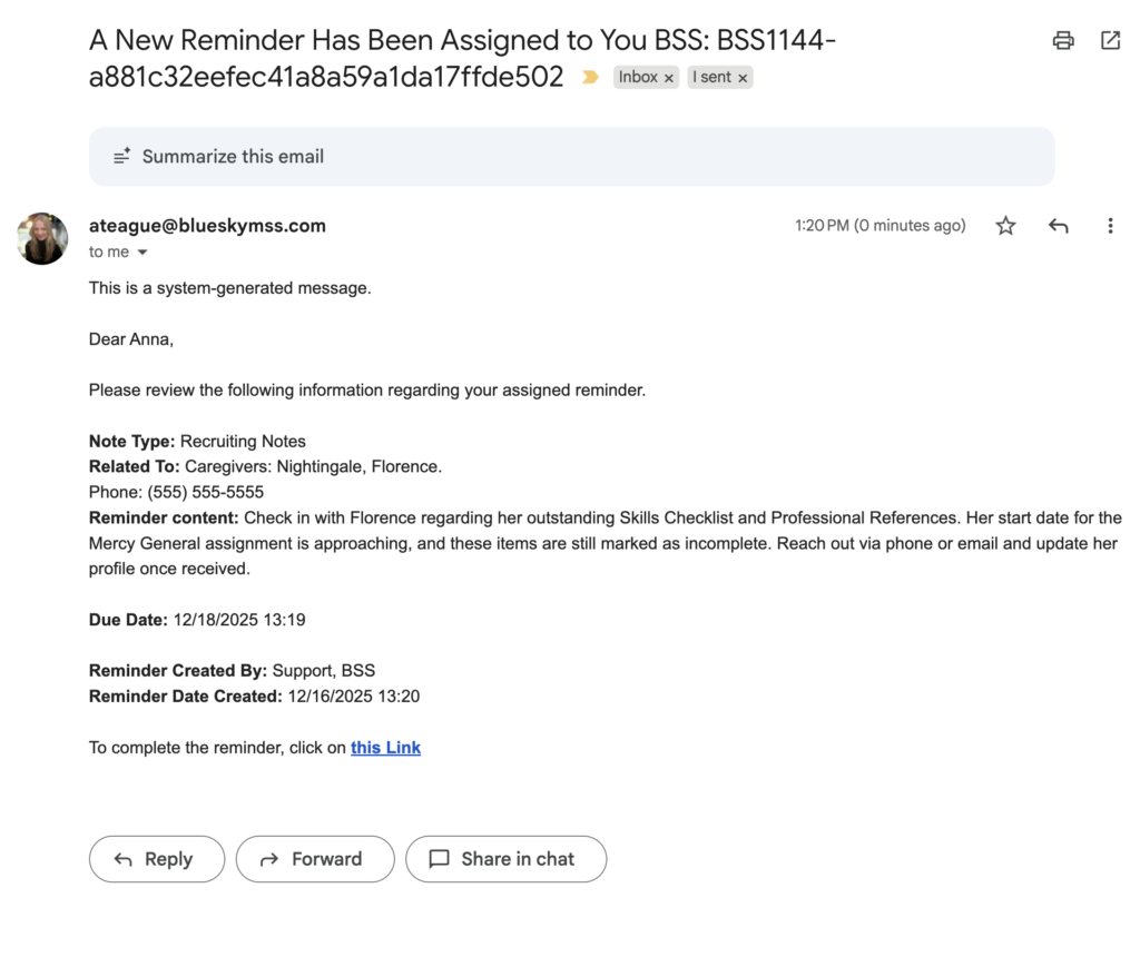 Reminders in BlueSky are now more actionable with automated email notifications. Assigned users can receive emails when a reminder is created and again on the due date, ensuring tasks don’t get missed. Emails include a one-click Mark as Complete option, allowing users to close out reminders directly from their inbox without logging into the system.