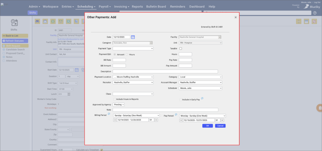 Bonuses and other payments can now be added directly from the shift scheduling screen. This streamlined workflow makes it easy to link payments to a specific shift without manual lookup, reducing errors and saving time when applying incentive pay.
