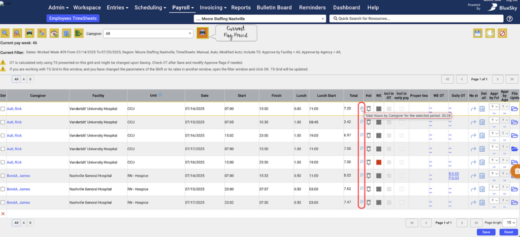 The Timesheet Grid now shows total hours by caregiver in two ways: in the All Caregivers view, a hover icon in the Total column displays each caregiver’s full-period hours across all pages (updated after saving), while filtering to a specific caregiver adds a live subtotal at the bottom of the grid showing hours on the current page only.
